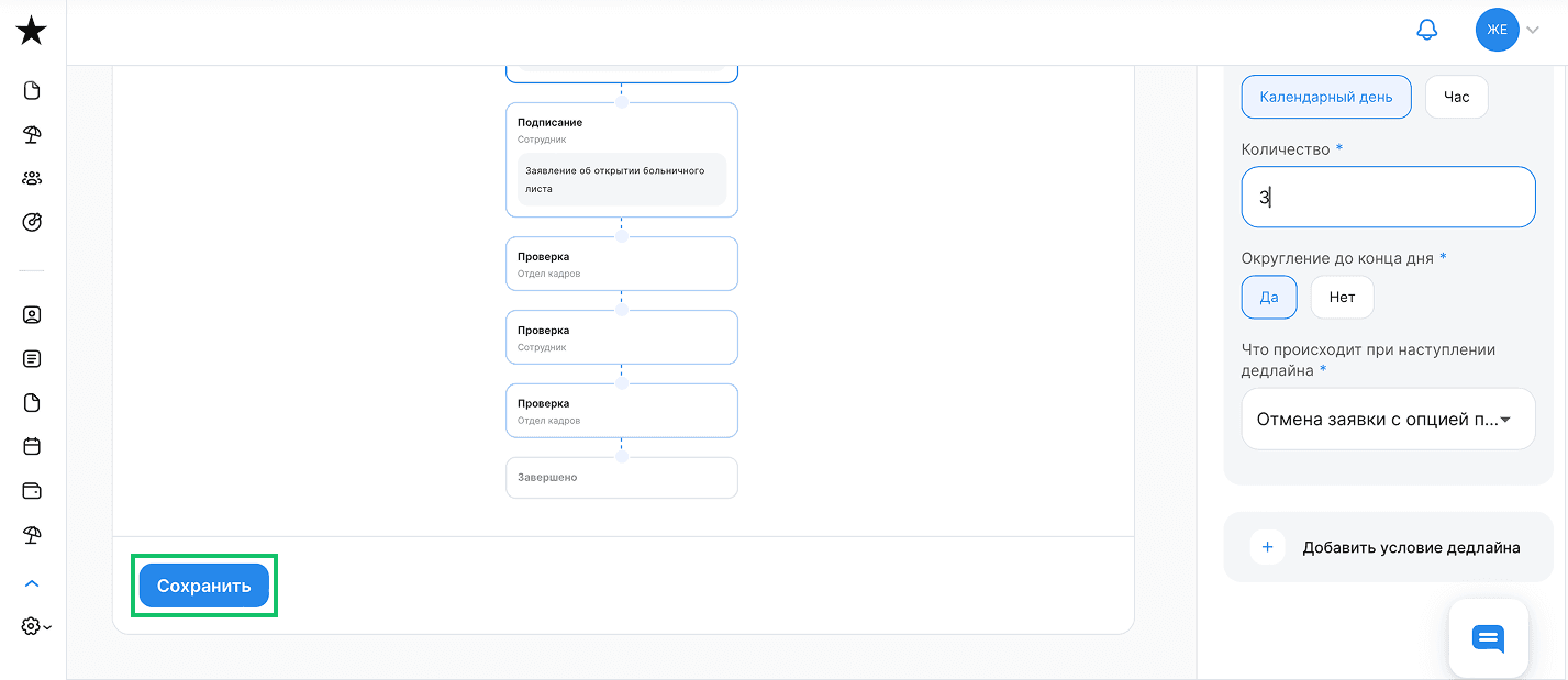 - Нельзя устанавливать дедлайн с автоматическим переходом на следующий этап для этапов "Загрузка", "Подписание" и иные, система выдаст ошибку.