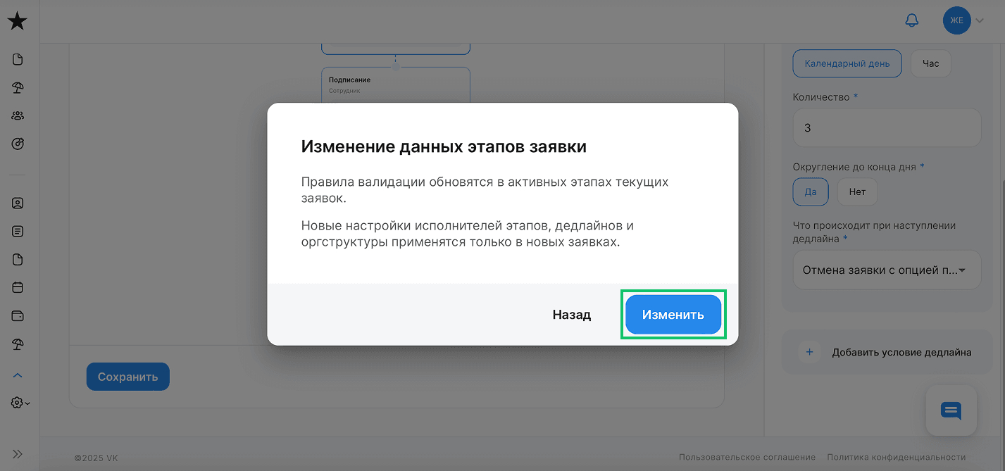 Чтобы подтвердить изменение дедлайна на этапе заявки, нажмите кнопку Изменить.