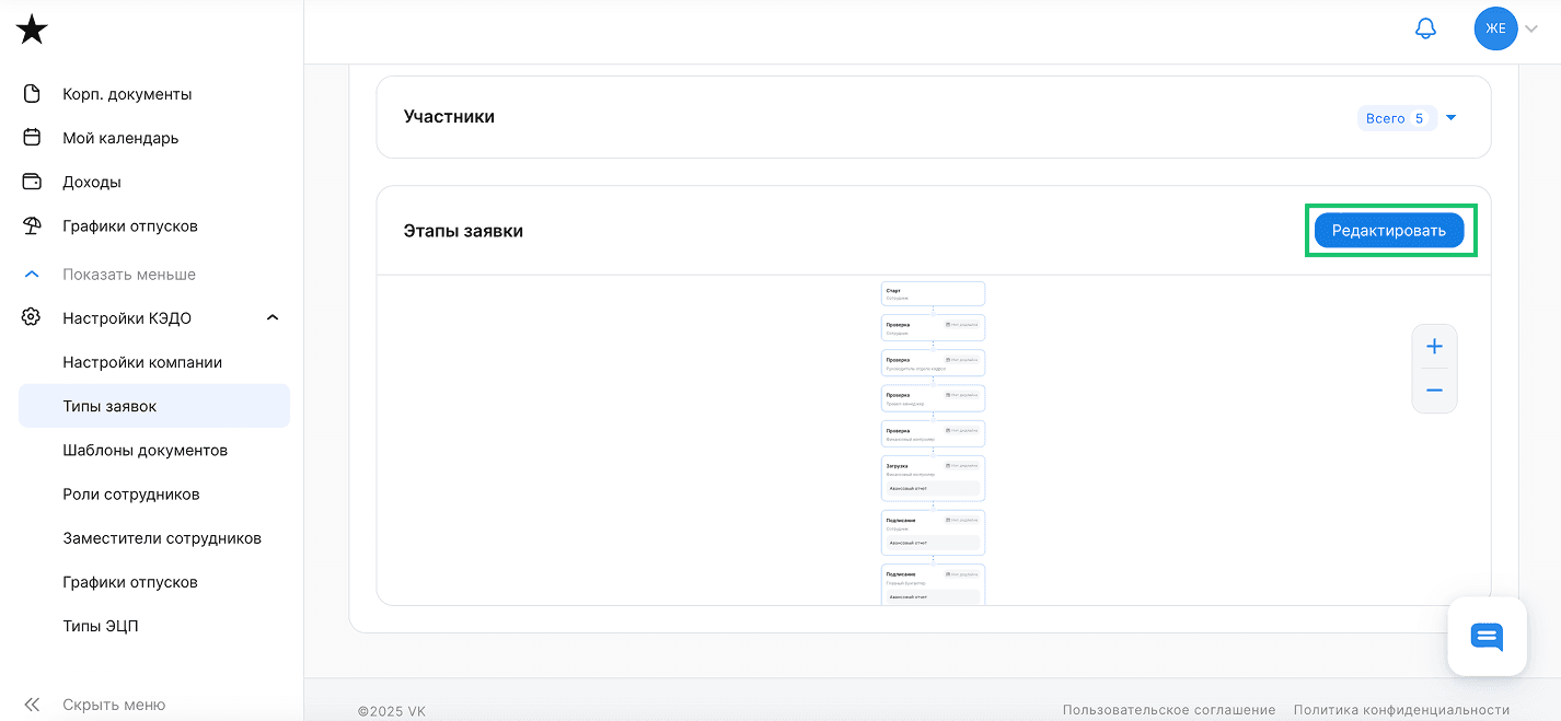 Для добавления и редактирования дедлайна на этапах бизнес-процесса перейдите в Настройки КЭДО → Типы заявок. Выберите интересующий тип заявки → Этапы заявки → Редактировать.