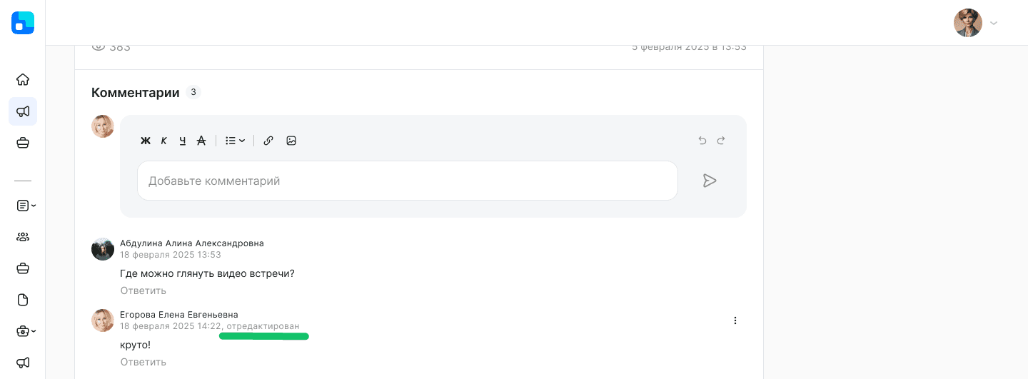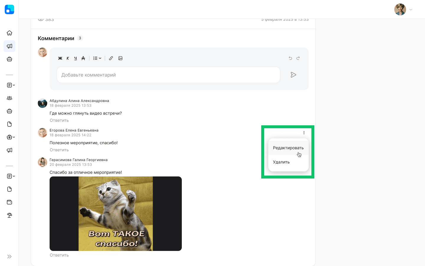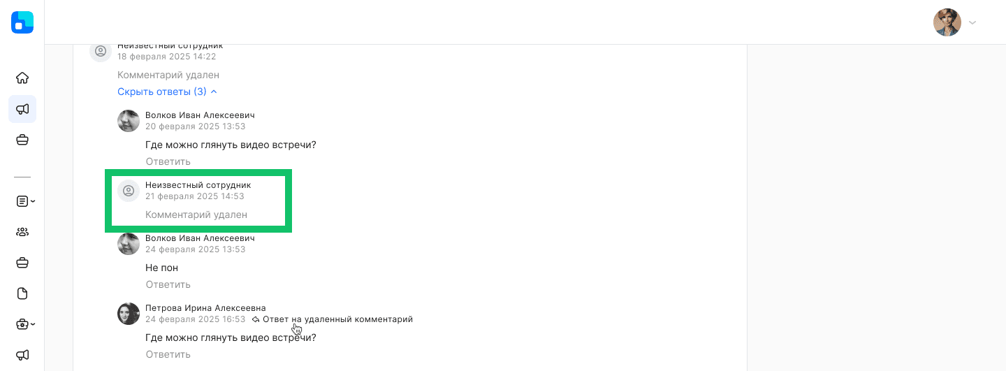 После удаления комментария вместо него будет отображаться метка «Комментарий удален», а на месте ФИО пользователя указан текст «Неизвестный сотрудник». Ответы на комментарий при наличии отображаются.