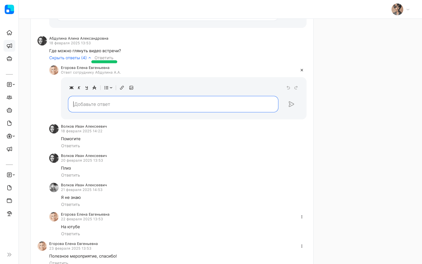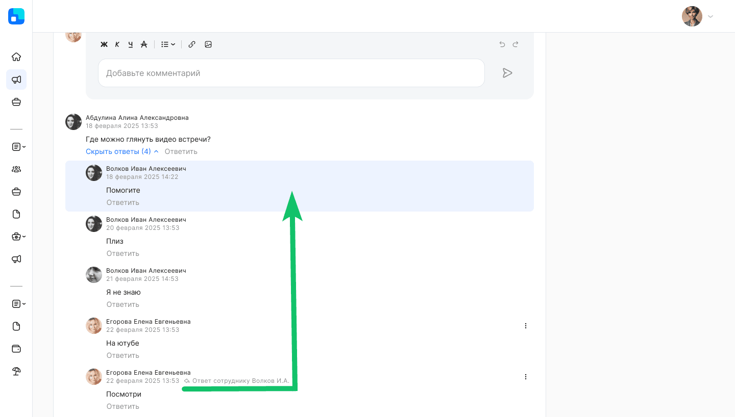 Чтобы просмотреть комментарий, к которому был оставлен ответ, нажмите на отметку «Ответ сотруднику …» рядом с датой ответа.