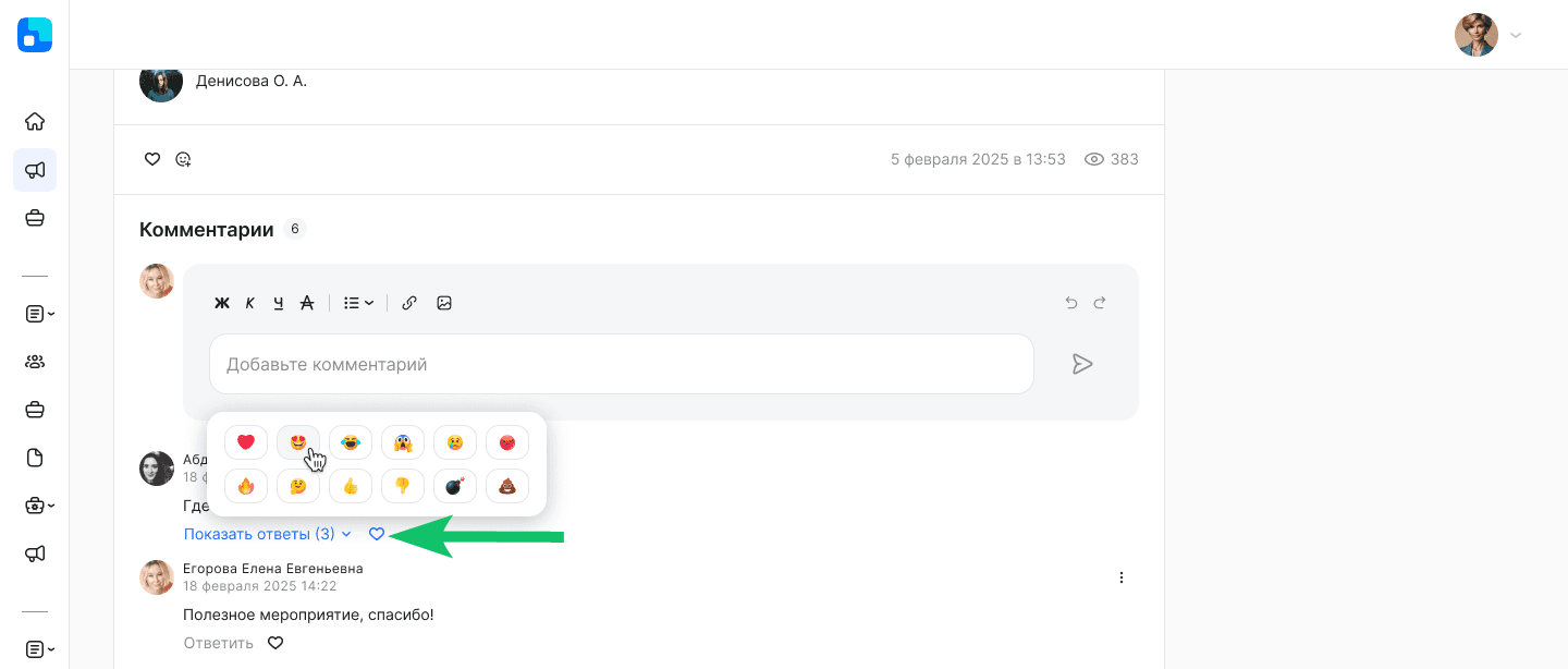 Для просмотра и простановки реакции к комментарию наведите курсор на значок , если реакций от других пользователей еще не было проставлено, или на список уже имеющихся у комментария реакций и нажмите на нужный значок реакции.