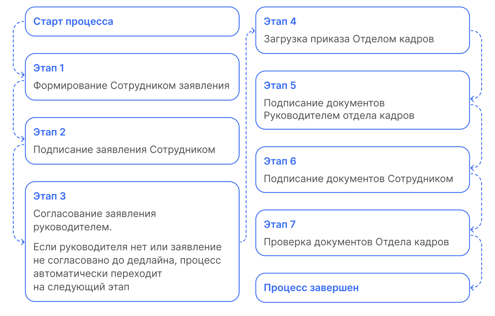 - Сотрудники отдела кадров могут обрабатывать заявки как в системе 1С, так и в Сервисах компании веб-сервиса VK HR Tek.