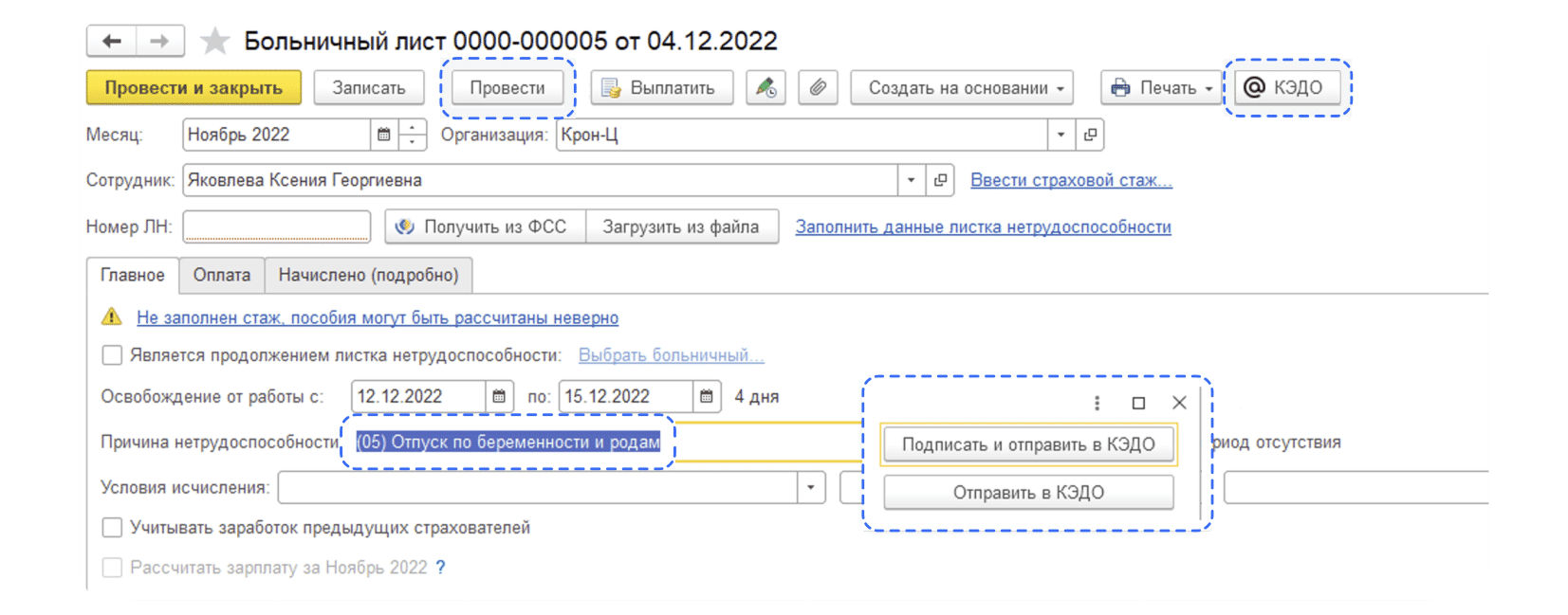 - В открывшемся окне проверяет данные, выбирает причины нетрудоспособности и нажимает кнопку Провести → кнопку КЭДО → Отправить в КЭДО.