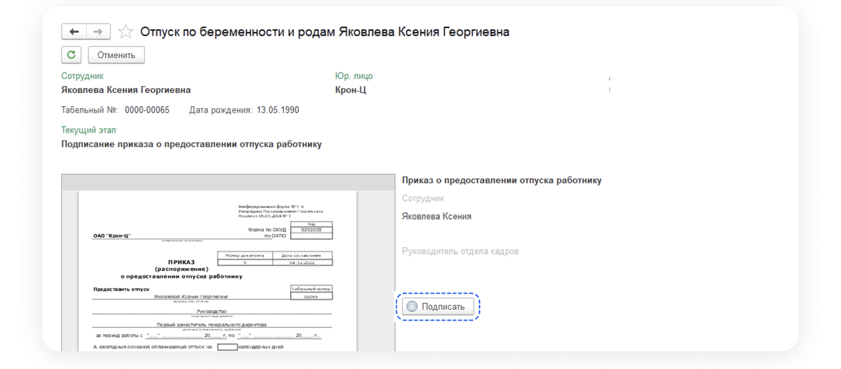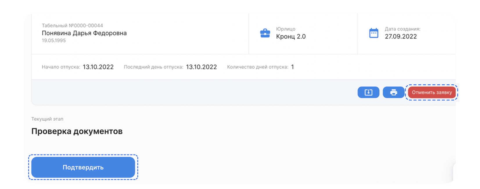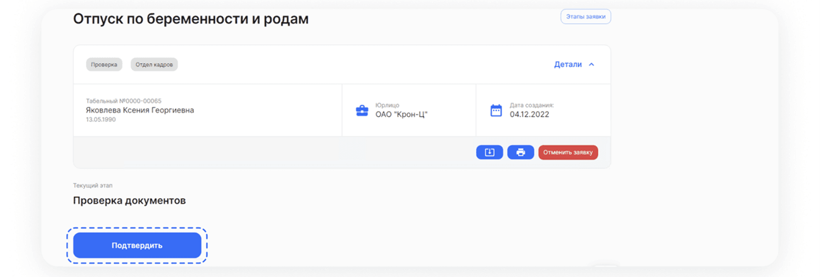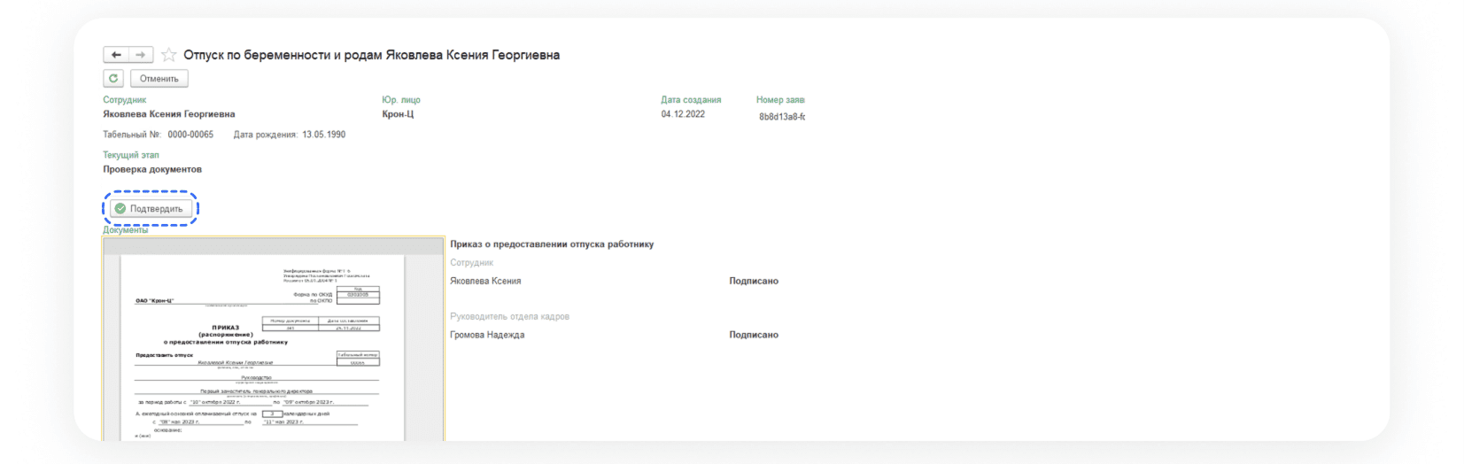 Сотрудник отдела кадров открывает нужную заявку в Рабочем месте кадровика и нажимает кнопку Подтвердить.