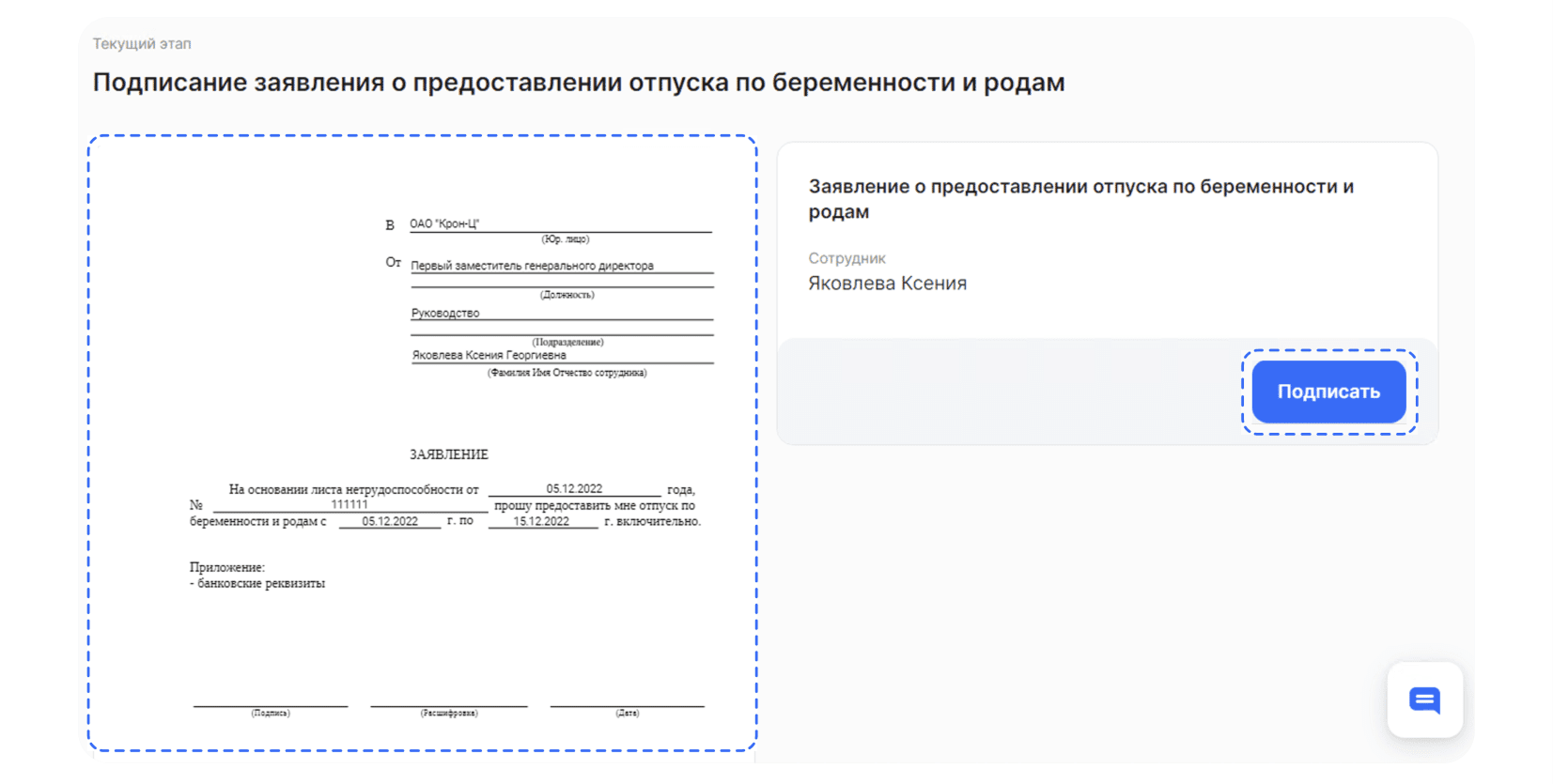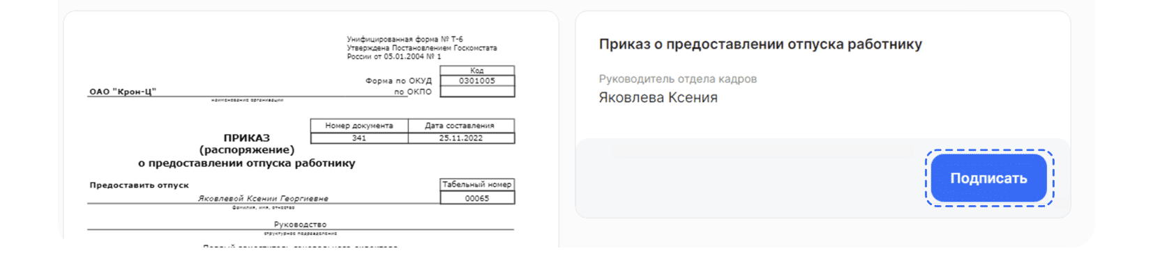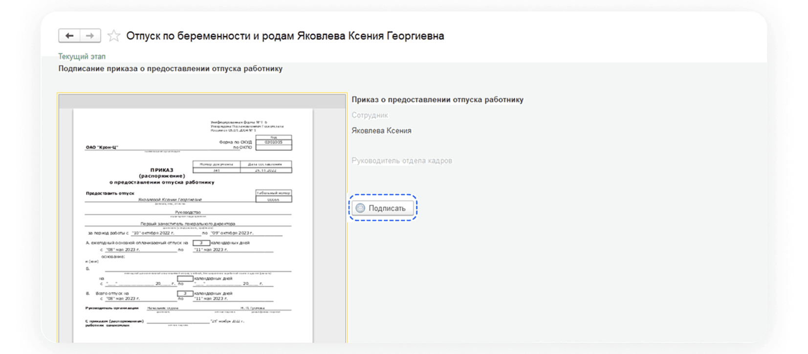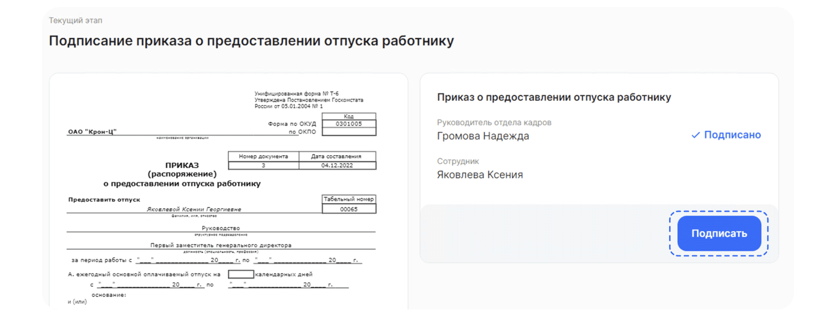Сотрудник отдела кадров открывает нужную заявку в Рабочем месте кадровика и нажимает кнопку Подтвердить.