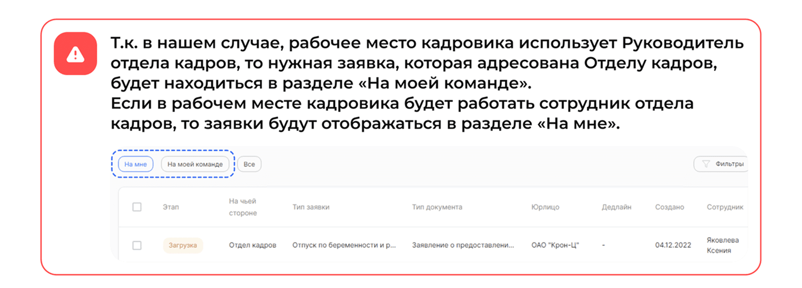 - Специалист переходит в Рабочее место кадровика, в раздел На моей команде и открывает нужную заявку.