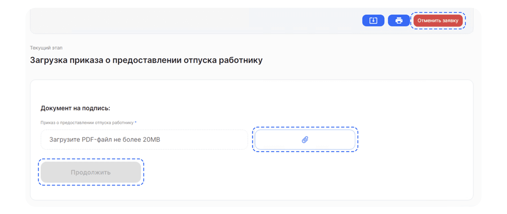 Приказ загружается только вручную. Для этого специалист нажимает кнопку с изображением скрепки и загружаете документ.