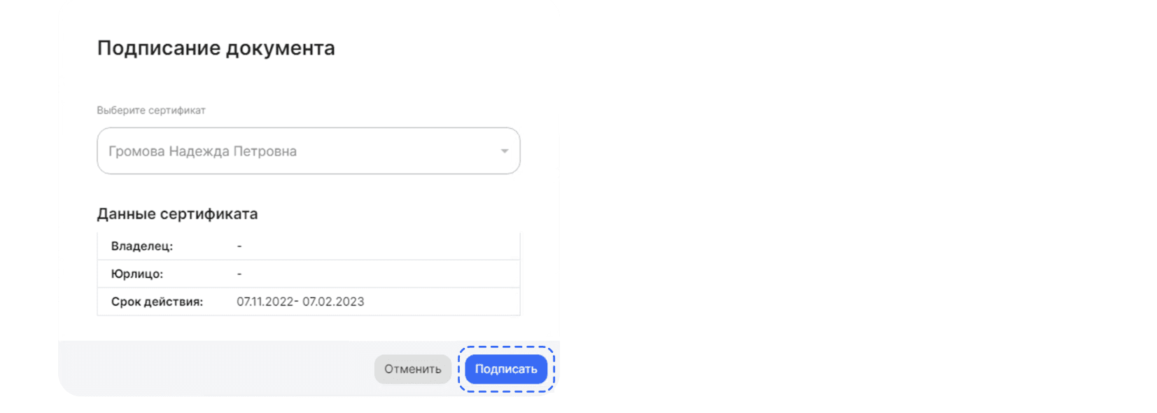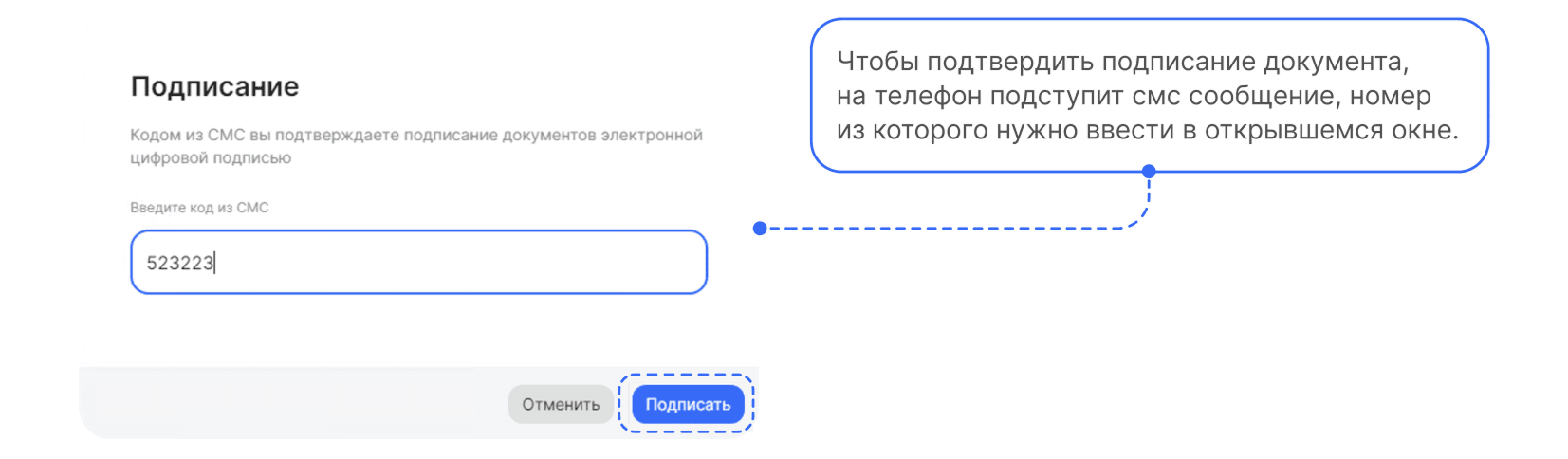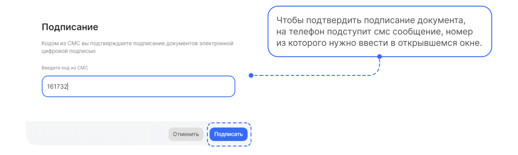 - Вводит код из смс и нажимает на кнопку Подписать.