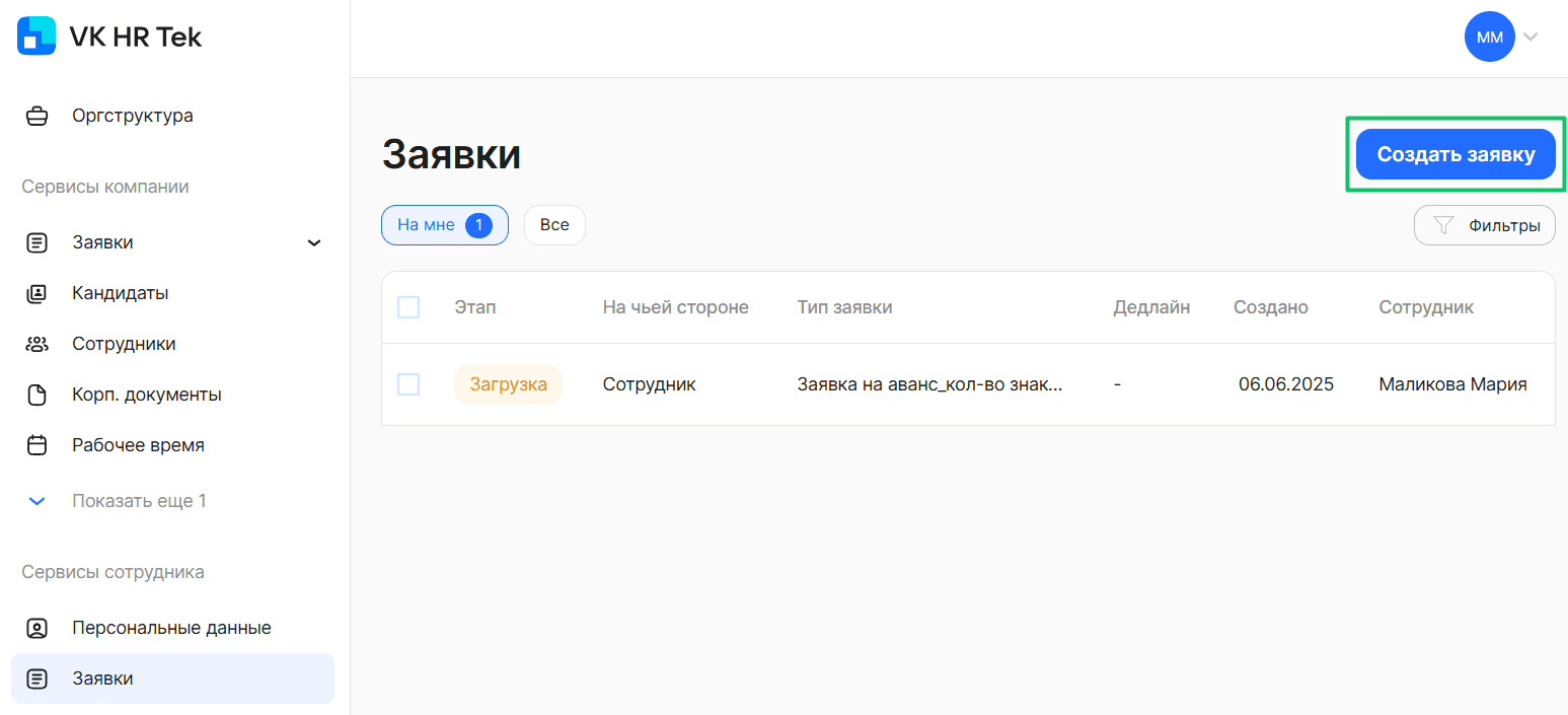 - Сотрудник Отдела кадров преходит в Сервисы компании веб-сервиса VK HR Tek, в раздел Заявки.