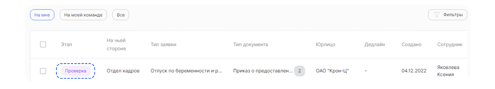 Сотрудник отдела кадров открывает нужную заявку с этапом Проверка в Сервисах компании → Заявки и нажимает кнопку Подтвердить.