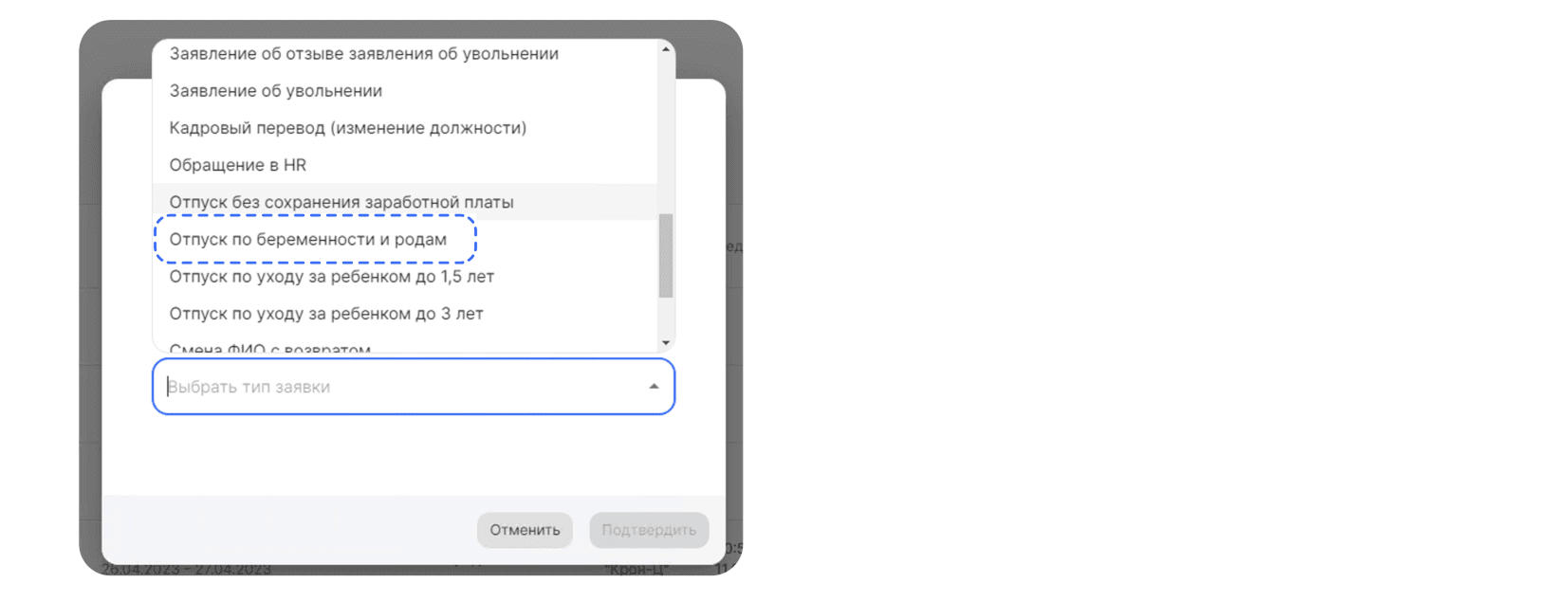 - Выбирает Заявление на отпуск по уходу за ребенком до 1,5 лет.