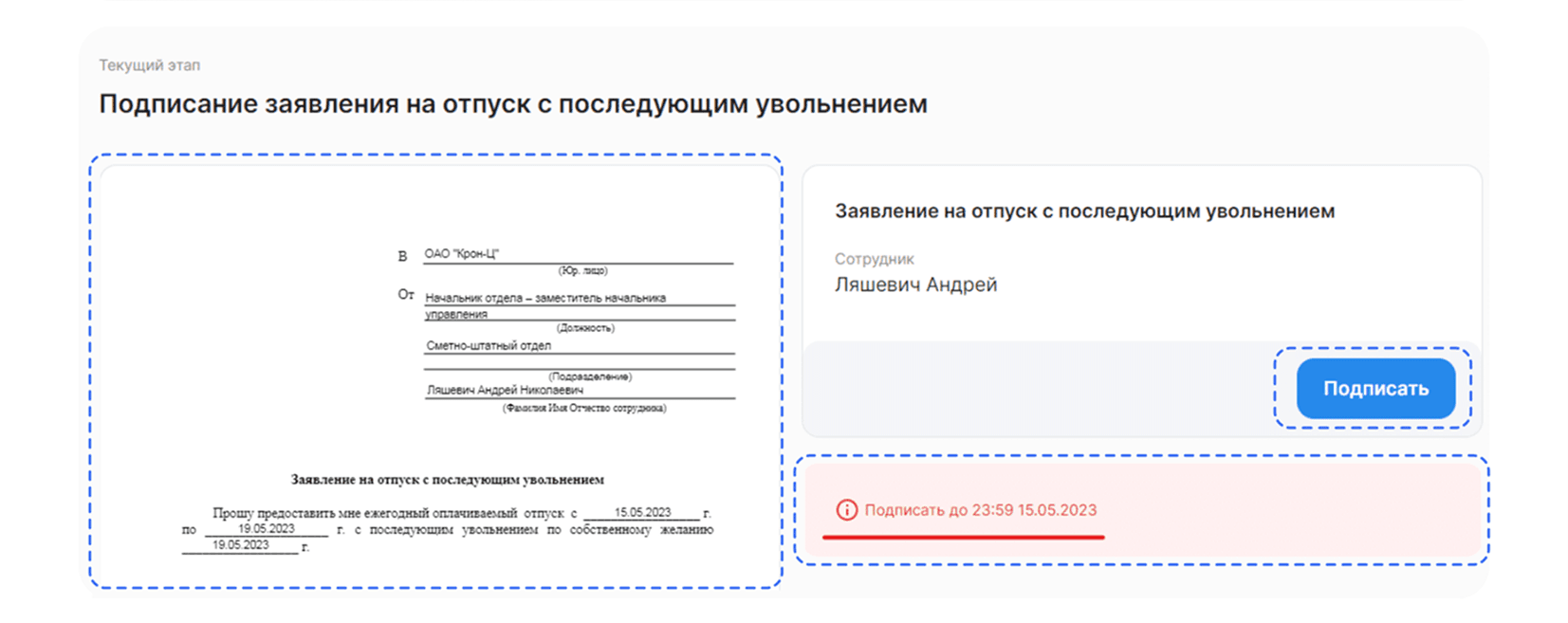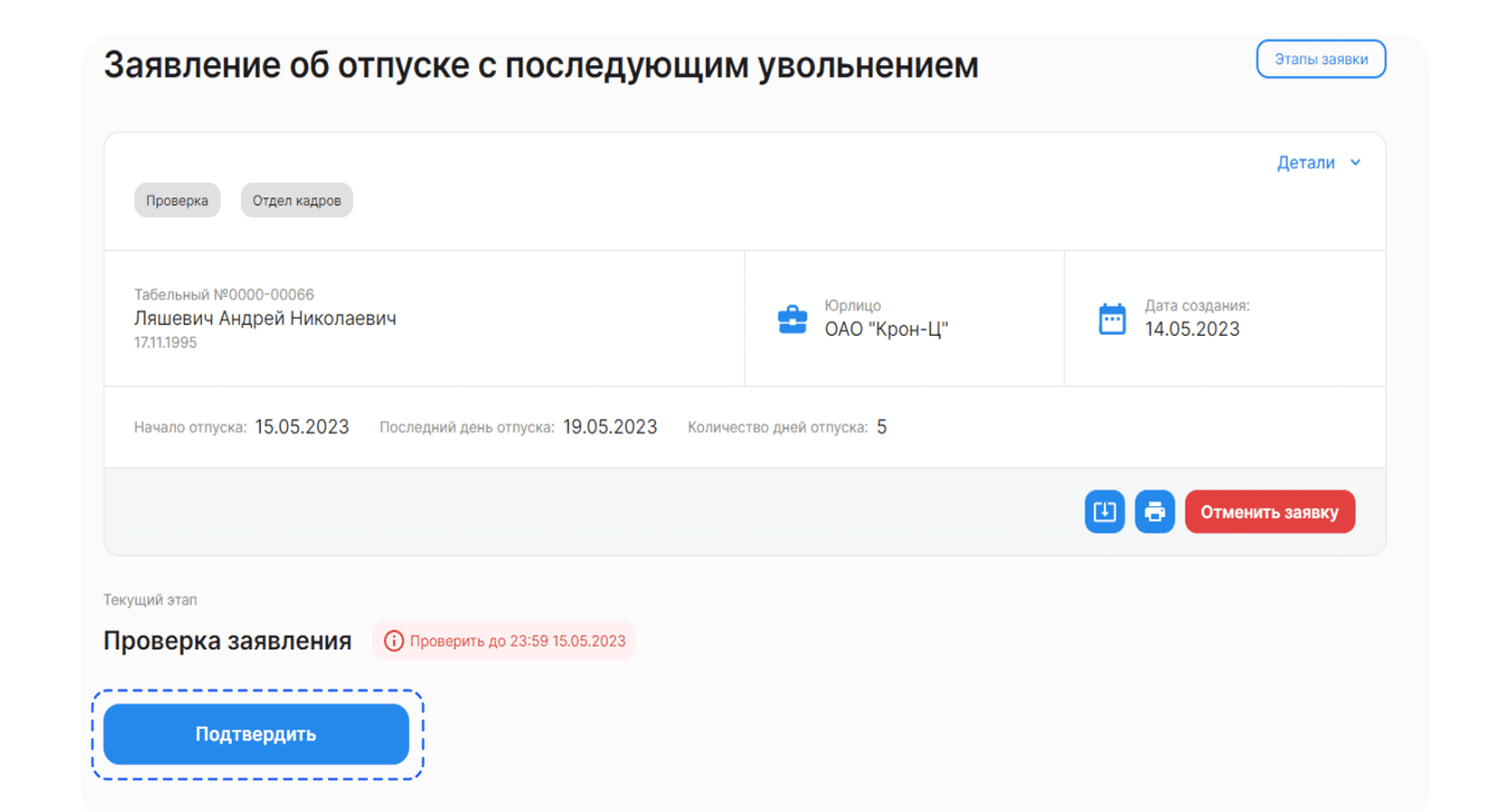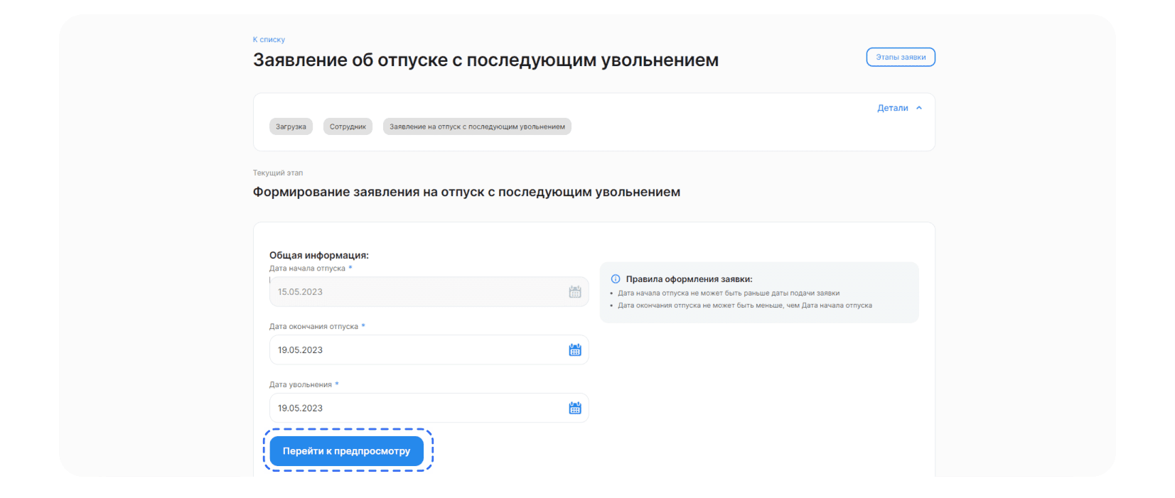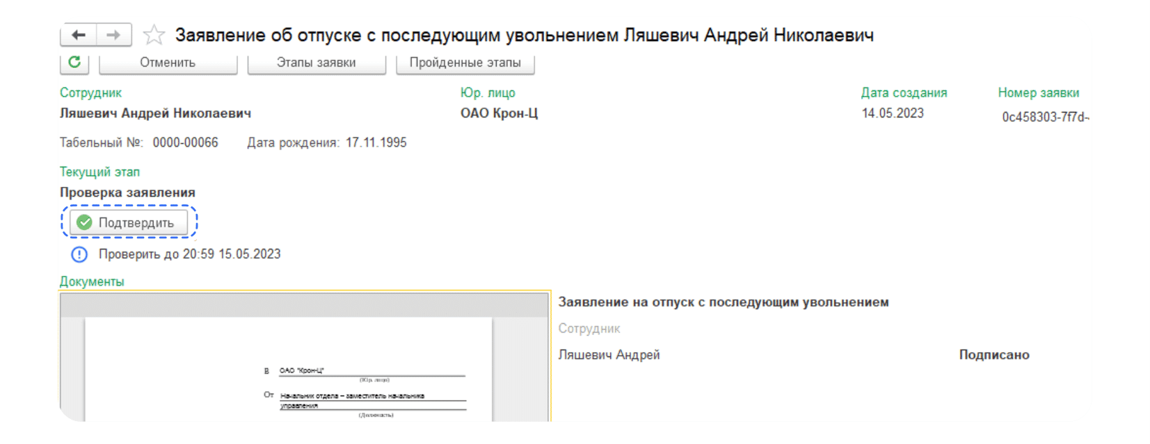 - Выбирает Заявление об отпуске с последующим увольнением.