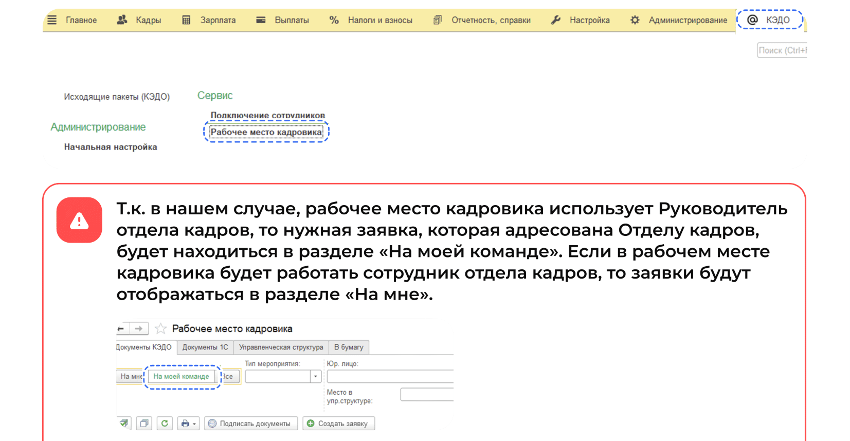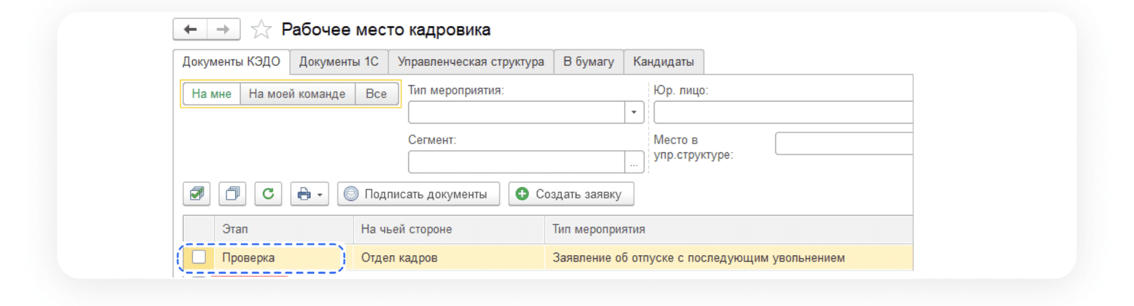 Сотрудник отдела кадров переходит в 1С → КЭДО → Рабочее место кадровика.