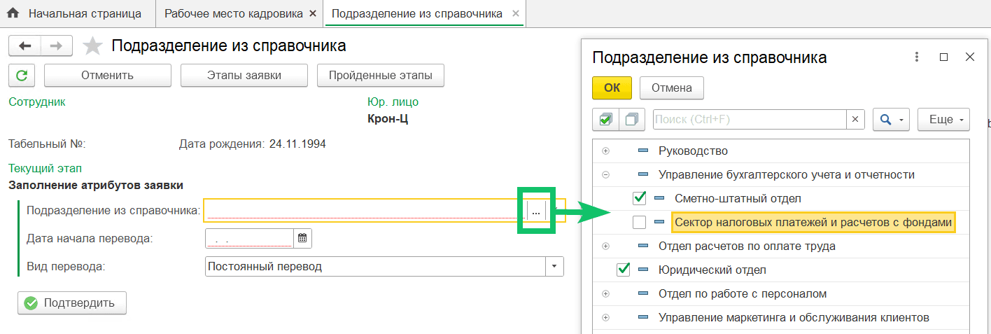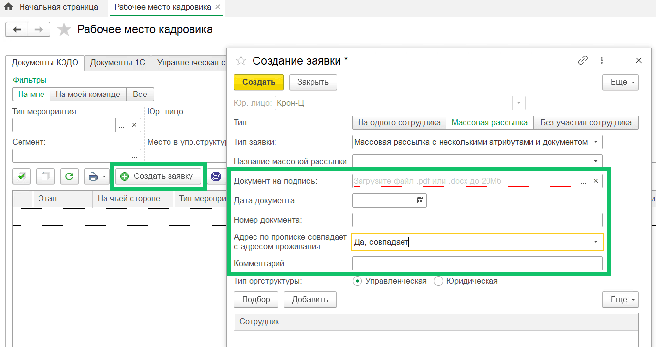 Чтобы заполнить атрибуты на этапе создания заявки, перейдите в раздел КЭДО → Рабочее место кадровика, создайте заявку с типом Массовая рассылка и выберите тип заявки.
