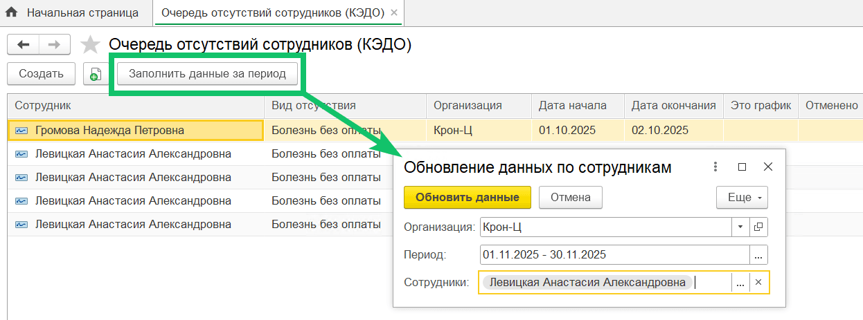 Чтобы переотправить данные об отсутствиях в КЭДО, в регистре сведений Очередь отсутствий сотрудников (КЭДО) нажмите кнопку Заполнить данные за период и обновите данные по сотрудникам.