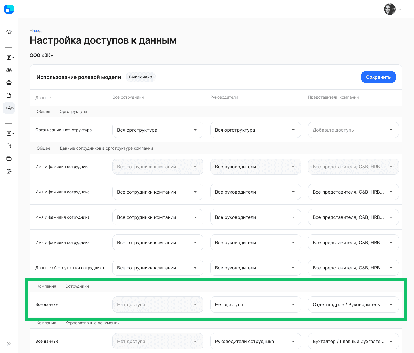 По умолчанию для блока Компания — Сотрудники в ролевой модели установлены значения: