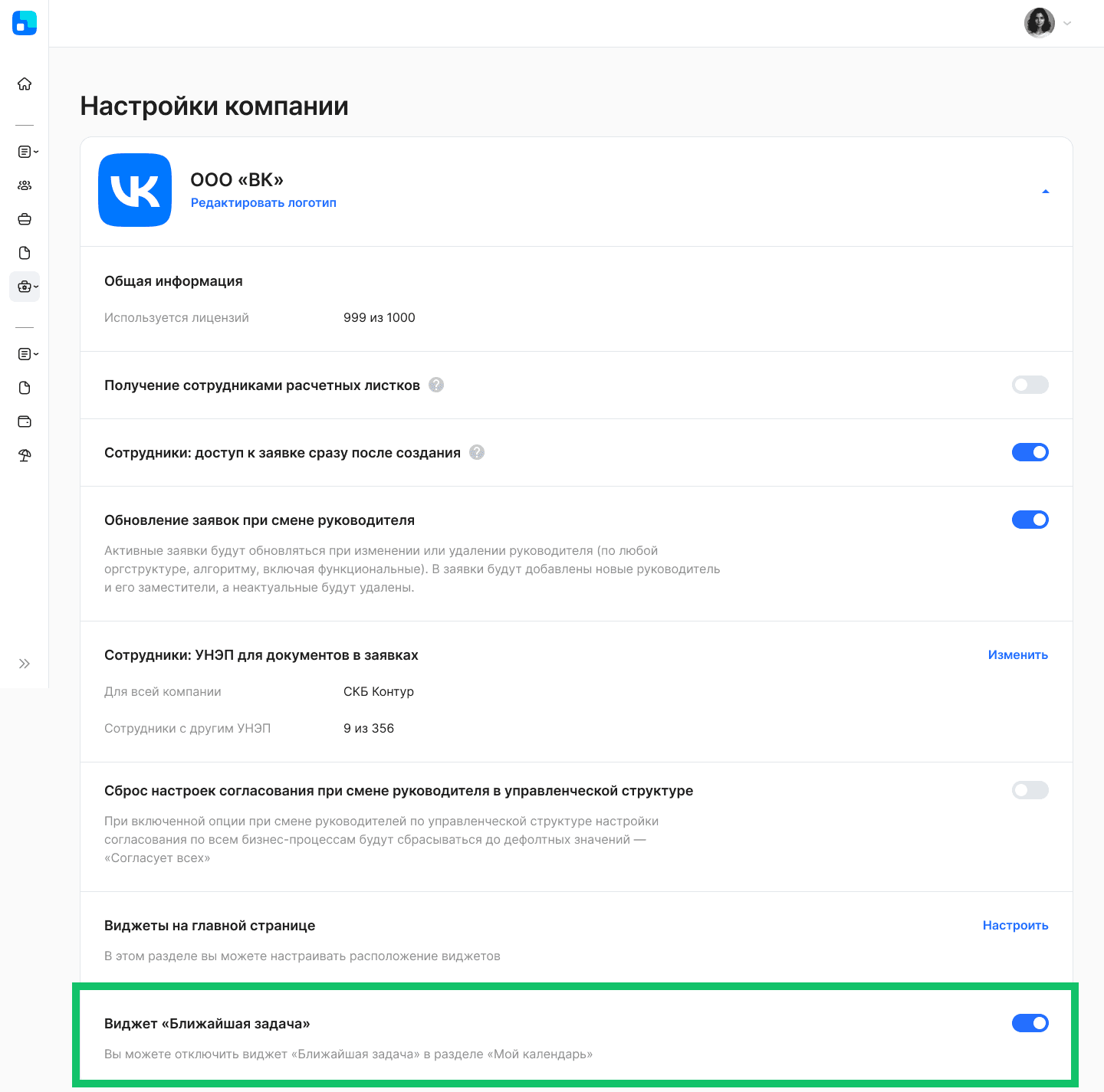 2. Добавили возможность включать или отключать видимость виджета Ближайшая задача в разделе Мой календарь для всех пользователей компании. Чтобы отключить видимость виджета, в разделе Настройки компании Администратор КЭДО должен активировать переключатель настройки.