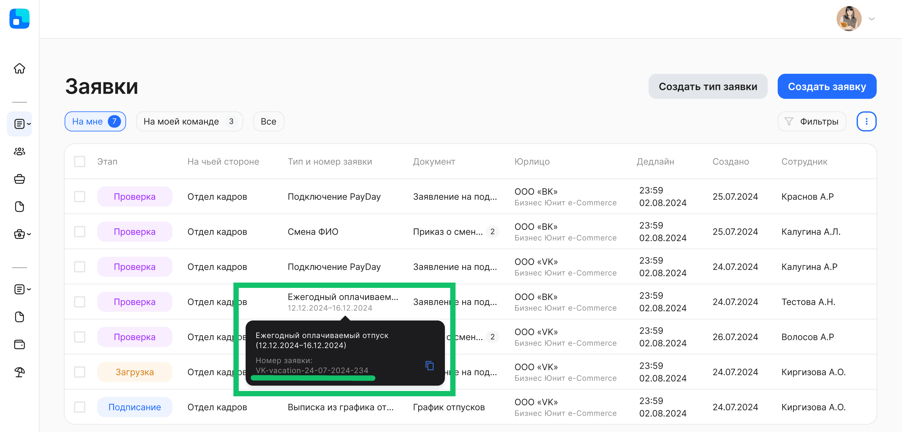 Добавили опцию для автоматического присвоения заявкам коротких уникальных номеров. Она работает для всех бизнес-процессов — включая анкеты кандидатов и графики отпусков.