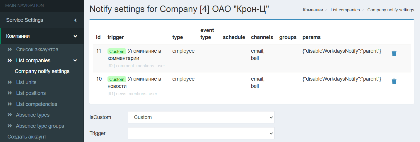 Чтобы получать такие уведомления, в разделе Компании → List companies → Company notify settings административной панели добавьте триггеры для кастомных уведомлений: