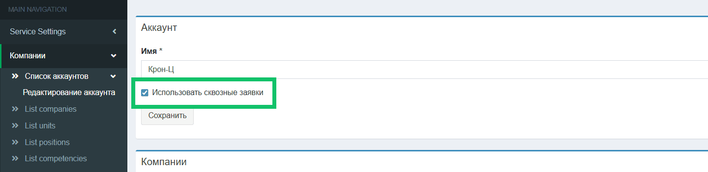 Для подключения опции Использовать сквозные заявки перейдите в административную панель, в раздел Компании → Список аккаунтов → Редактирование аккаунта.