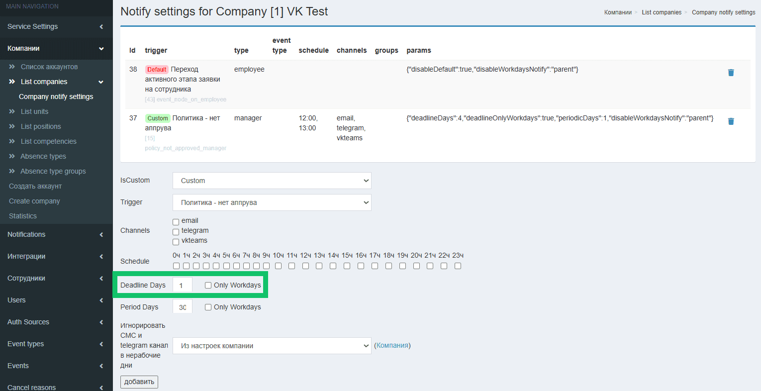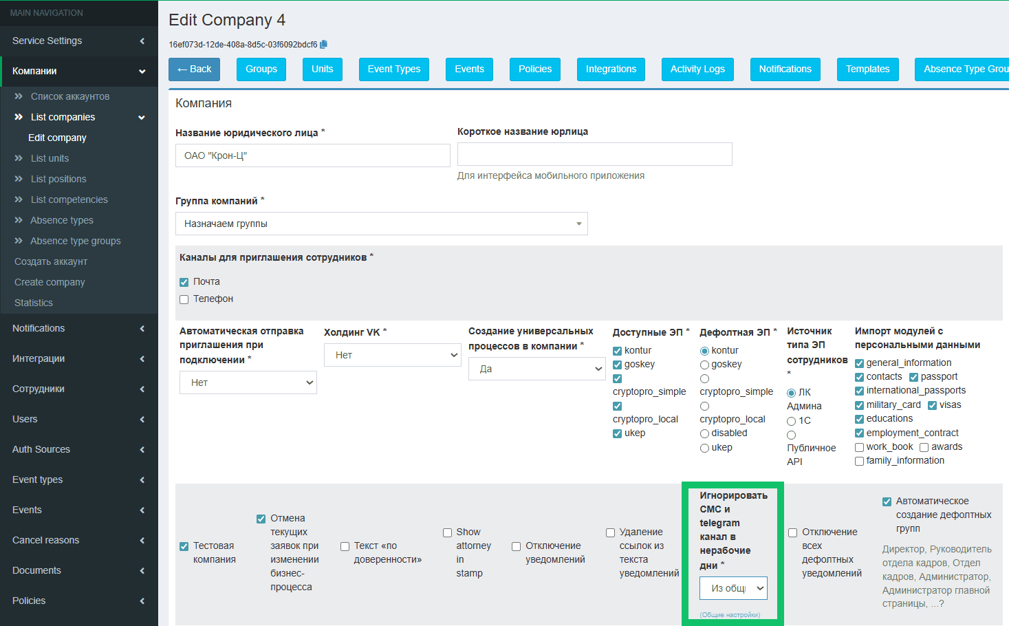 Чтобы настроить получение уведомлений на уровне компании, перейдите в раздел Компании → List companies → Edit company административной панели и активируйте настройку Игнорировать СМС и telegram канал в нерабочие дни с одним из вариантов: Из общих настроек, Да, Нет.