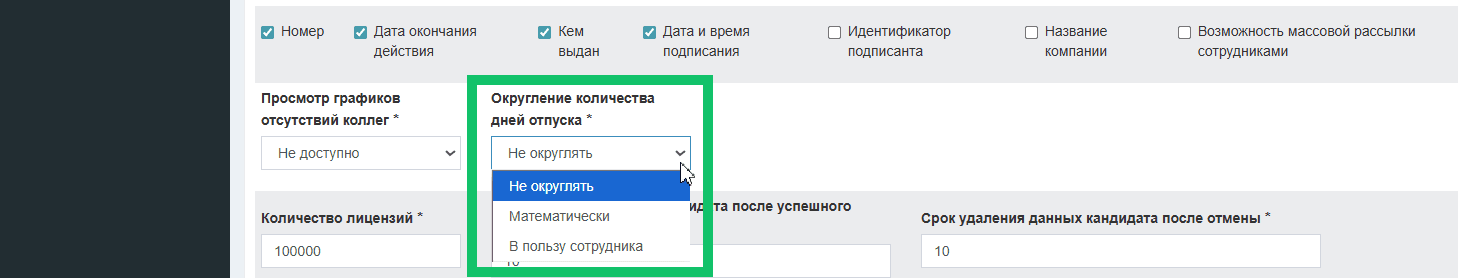 1. Добавлена настройка для округления накопленных дней отпуска у сотрудника. Настройка позволяет округлять дни математически, в пользу сотрудника или не округлять совсем.