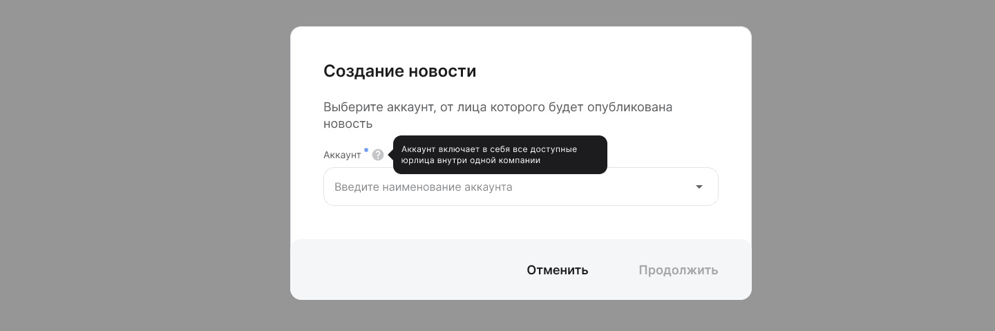Пример 2. У пользователя есть права доступа только к одному юрлицу аккаунта «Цветы и цветочки». При создании новости этот аккаунт будет выбран автоматически.