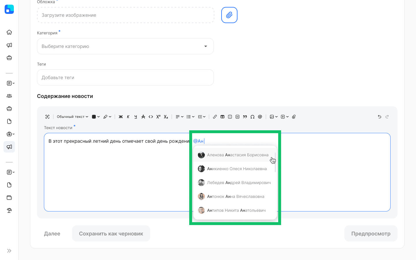 Пользователи могут упомянуть других пользователей через @ в тексте новости или в комментарии к новости. Упоминание является ссылкой на профиль пользователя.