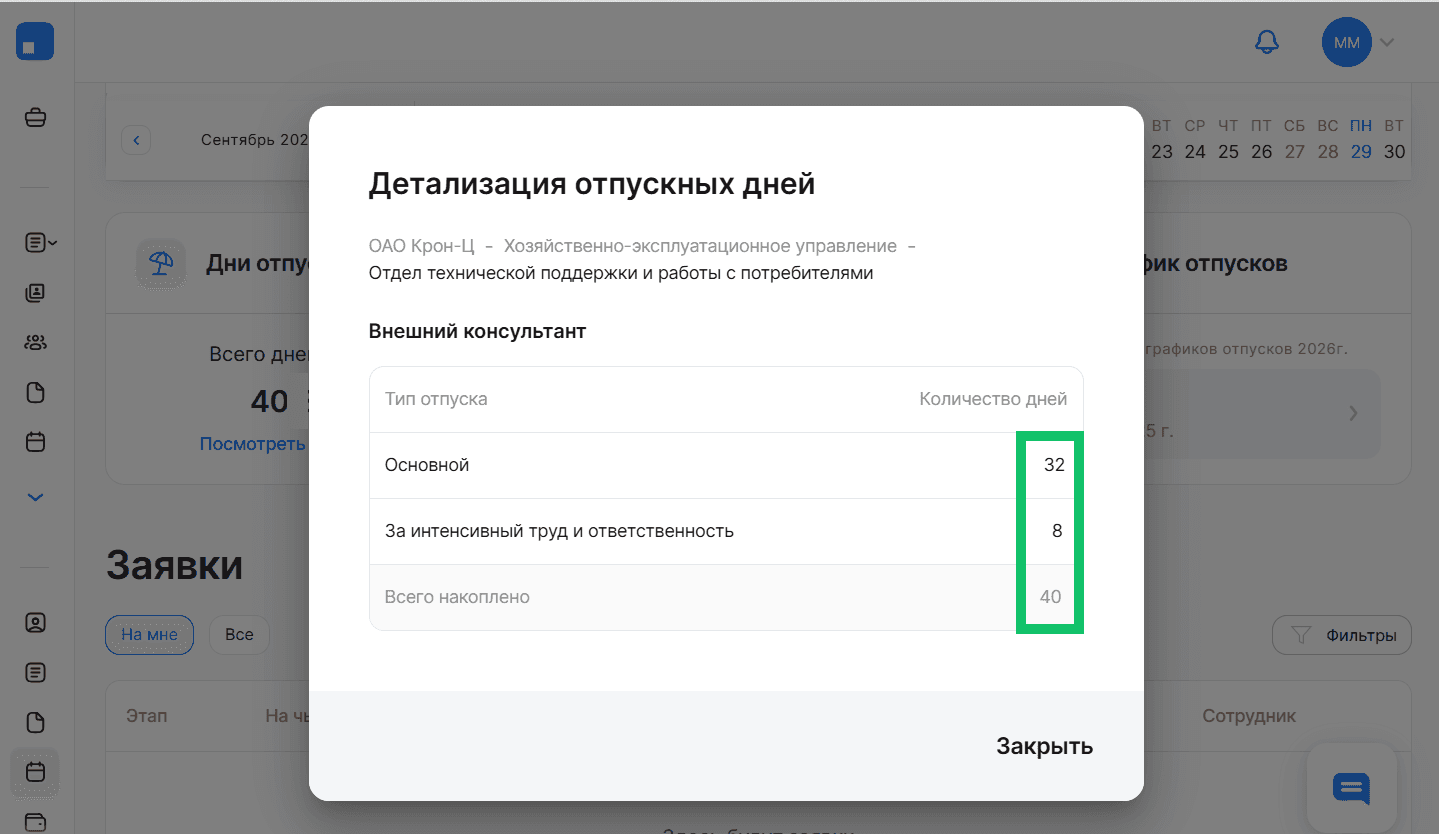 На странице Мой календарь, в виджете Дни отпуска сотрудник может просмотреть доступное количество наколенных дней отпуска.