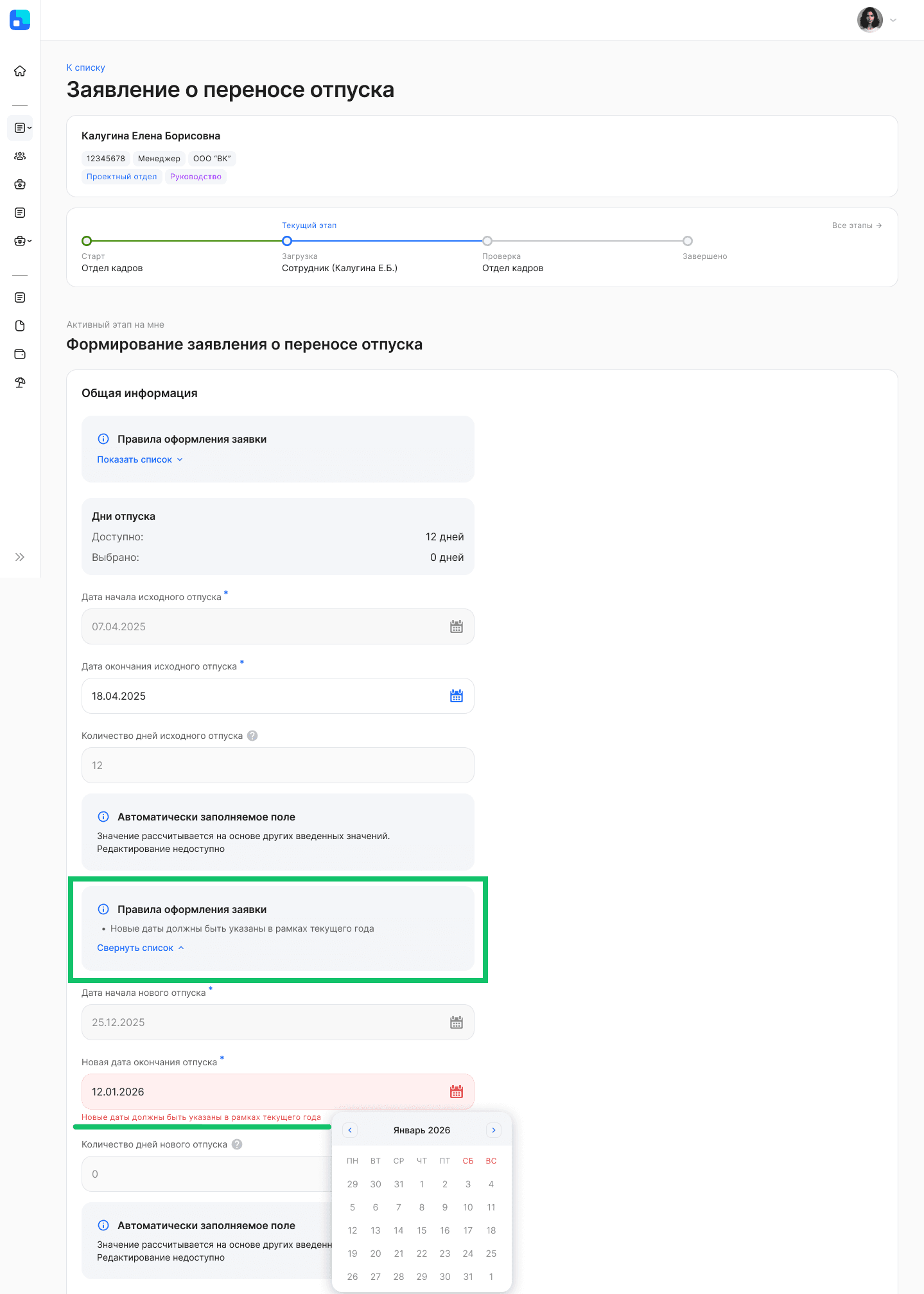 Добавлен валидатор, который позволяет пользователю вводить даты строго в рамках текущего года. Например, полезно для случаев, когда разрешено переносить отпуск только в рамках текущего года.
